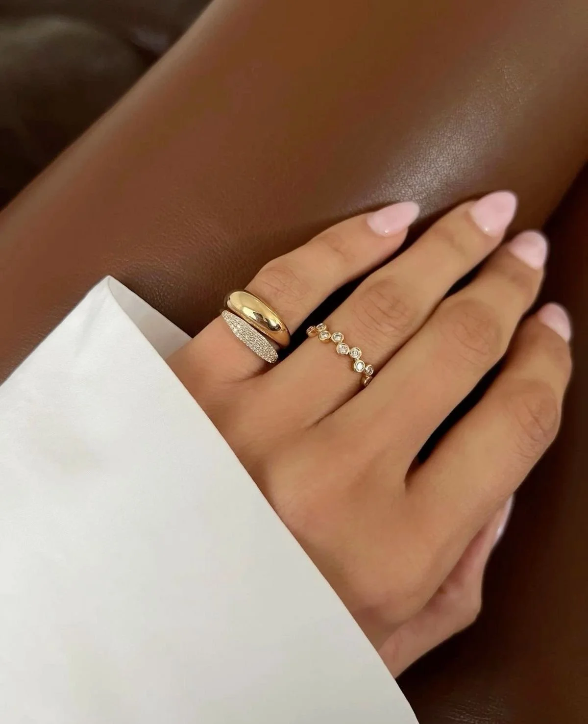 The Capri Stack is a full-hand story in one ring. It is best styled on fingers that allow the interlocking loops to move and catch the light: