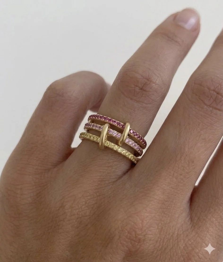 The Capri Stack is an effortlessly layered statement. Featuring three individual pavé-set bands in gradient shades—Deep Fuchsia, Blush Pink, and Golden Honey—this set is held together by two high-shine interlocking loops. It provides a curated "perfect stack" look with the comfort and security of a single integrated piece.